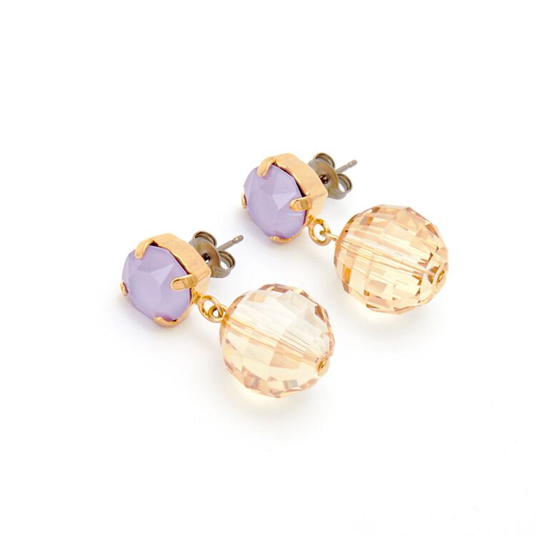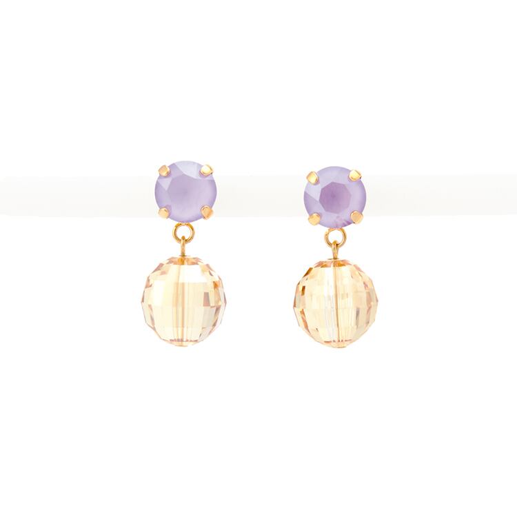 高度な技術により、多面カットが施されたクリスタルを使っています。ノーブルな光彩を放つクリスタル「ライラック」と「ゴールデンシャドウ」、丸いフォルムの上品な煌めきが、女性らしさを感じさせてくれます。