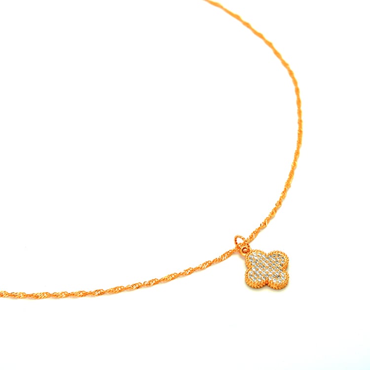「四葉のクローバー」のパヴェを、チャームにあしらった”スクリューチェーン”のネックレス。ひとつひとつの葉に「愛・健康・幸福・富」の意味があり、幸せを運んできてくれるともいわれています。